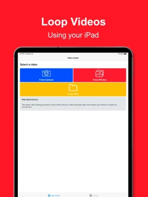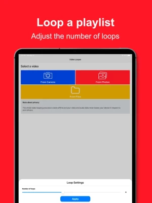 -- Works Offline Video Looper works offline, using your device's computational power to convert the videos. Your video and audio data never leaves your device in respect to your data privacy.