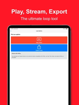 -- Play, Stream or Export You can play your looped video locally on your device, stream it via AirPlay to an external screen or even export it as an .MP4 file!