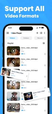 ● Video player supports all video formats including MP4, MOV, M4V, MKV, WMV, RMVB, FLV, AVI, 3GP, TS etc.