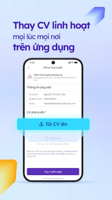 - Tạo và cập nhật hồ sơ cá nhân: Hoàn thiện hồ sơ cá nhân trực tiếp trên app, giúp tăng khả năng được tiếp cận bởi các nhà tuyển dụng uy tín.