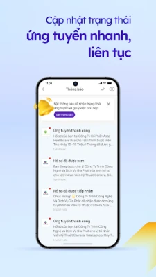 - Thông báo trạng thái hồ sơ: Luôn được cập nhật về trạng thái hồ sơ được phản hồi từ nhà tuyển dụng – giúp bạn chủ động hơn trong quá trình tìm việc.