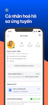 Trải nghiệm tìm việc một cách chuyên nghiệp trên di động cùng ứng dụng VietnamWorks – Việc Làm và Tuyển Dụng. Chỉ với một ứng dụng duy nhất bạn sẽ có thể tìm việc tốt nhất theo cách nhanh nhất, ứng tuyển vào công việc phù hợp nhanh chóng và dễ dàng cập nhật hồ sơ, gây ấn tượng và lọt vào mắt xanh của nhà tuyển dụng, chỉ với chiếc smartphone của mình.