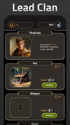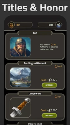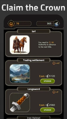 • Progress through 12 titles: Thrall Boy → Thrall → Freeman → Hunter → Bond → Warrior → Huscarl → Jarl → Tan → Conung → King