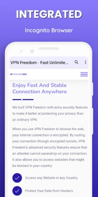 VPN Freedom App provide you fast and free VPN with secure unlimited proxy. There is no time, bandwidth or speed limitation. We have strict no-logs policy and you can surfing securely via our fast VPN and its integrated incognito browser. Now you can unblock sites and apps with fast and free VPN Freedom App.