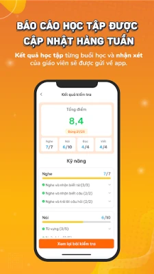 - Kết quả học tập và nhận xét, của giáo viên sẽ được cập nhật đều đặn trên app, giúp phụ huynh dễ dàng theo dõi.