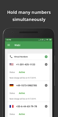 • Wabi provides numbers from 30+ countries, but if there's no local phone number available for your country, you may still get a US number or any other number and use it to activate a WhatsApp account!