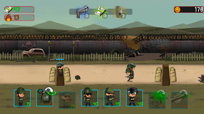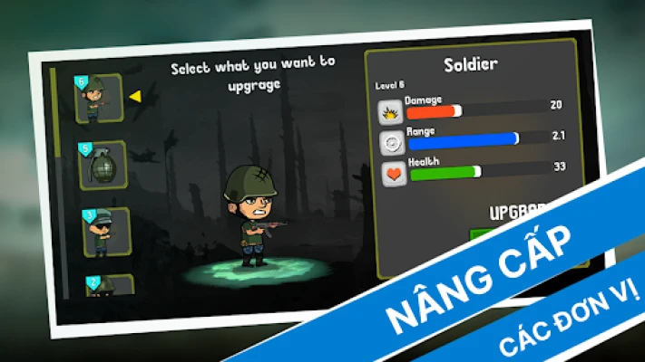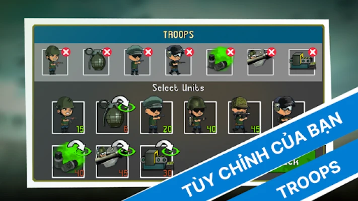Leo lên các cấp độ để mở khóa quân đội và thiết bị quân sự mới. Bạn có thể sử dụng sĩ quan, binh lính, pháo binh, boongke, lính bắn tỉa, xạ thủ máy, xe tải, bazooka, mìn, khói, xe tăng và nhiều hơn nữa.