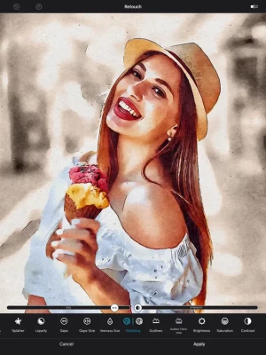 Your finger is your brush. Touch-up specific areas in your images that need attention. 13 tools allow to add or remove details, outlines, splatter, gaps and much more. Waterbrush supports the Apple Pencil as well.
