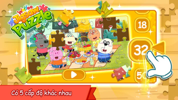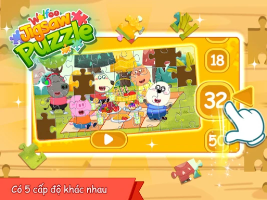 Wolfoo Jigsaw Puzzle là một trò chơi ghép hình miễn phí. Giao diện và hình ảnh trong game được thiết kế cẩn thận, dễ chơi. Các loại ảnh bao gồm: Wolfoo khám phá đại dương, Thức ăn, Công việc, Pop It, v.v. Có loại cấp độ trong trò chơi ghép hình. Số lượng mảnh khác nhau, là 8, 18, 32, 50 và 72. Bạn có thể chọn tùy theo cấp độ trò chơi của riêng mình.