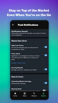 • Enable notifications for price alerts, breaking news, earnings reports, and more