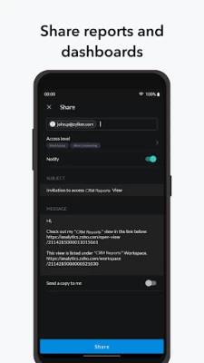 With this app, you can see all the data, reports and dashboards that you created and have in your Zoho Analytics account. You can interact with the reports, favorite those that you like or view very often, share them with your colleagues, clients and friends with fine-grained access control, and do much more.