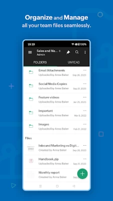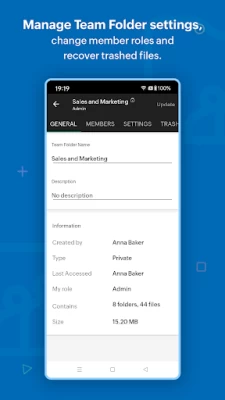 Work as a team: Create Team Folders, add members, and assign role-based access to them. You can modify settings, monitor trash, and restore deleted files with a tap.
