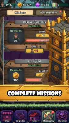 Collect resources even while offline! Use gold, gems, and population points to enhance towers, unlock heroes, and prepare for bigger and stronger zombie hordes.