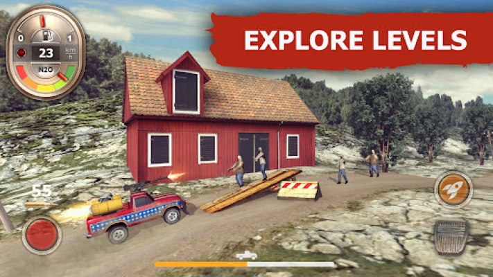 5 cars are available to get you to the final fort, each capable of holding progressively more loot. Ranging from the simple Redneck pick-up and the classy Hunter and to the tough Sledge and frankly-silly Harvester, you’ll enjoy throwing these bodged-up jalopies at the lines of the undead. Each is highly customisable, with 15 upgrades including spiked bumpers, improved tyres, buffed engines, and more ammo, fuel and nitro.